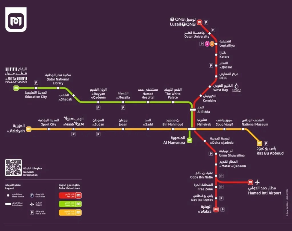 Sources: https://qttar.com/metro-map-qatar/, https://www.qr.com.qa/home, https://corp.qr.com.qa/English/Projects/Pages/DohaMetro.aspx