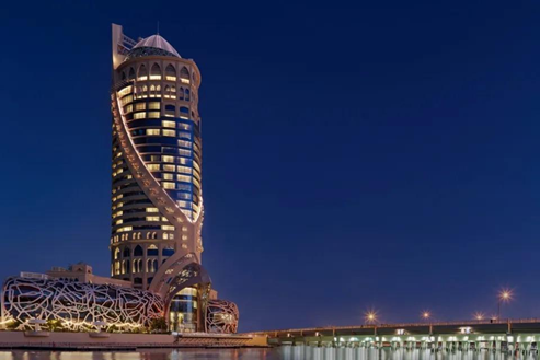 - Sat along the Lusail Marina Promenade—the waterfront of Qatar’s city of the future—this architectural landmark connects oceanfront calm with new vision. Architecture inspired by the coral formations of the Arabian Gulf reshapes the skyline with fluid, sculptural form. Textured interiors and asymmetric façades mirror the Arabian mashrabiya patterns, blending local symbolism with global design.